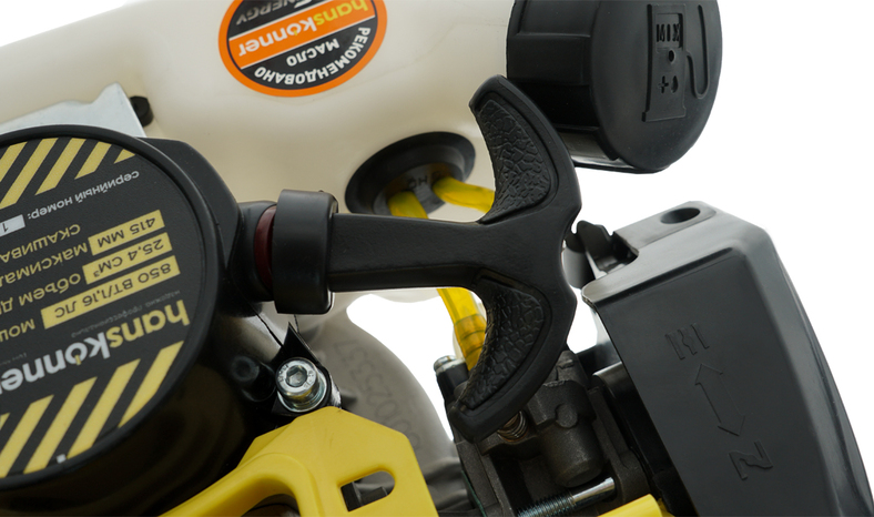 Оптимально подобранная рукоятка с антивибрационным покрытием снижает нагрузку на руки пользователя во время работы. Усовершенствованная плечевая разгрузка оптимально распределяет вес и не сковывает движения рабочего инструмента повышая производительность труда на 20 процентов. Удлиненная штанга увеличивает полезную площадь захвата и помогает обрабатывать любые труднодоступные места. Усиленный металлический вал в сочетании с прямой штангой позволяет работать с большей мощностью. Топливный бак из матового пластика облегчает контроль за уровнем топлива.