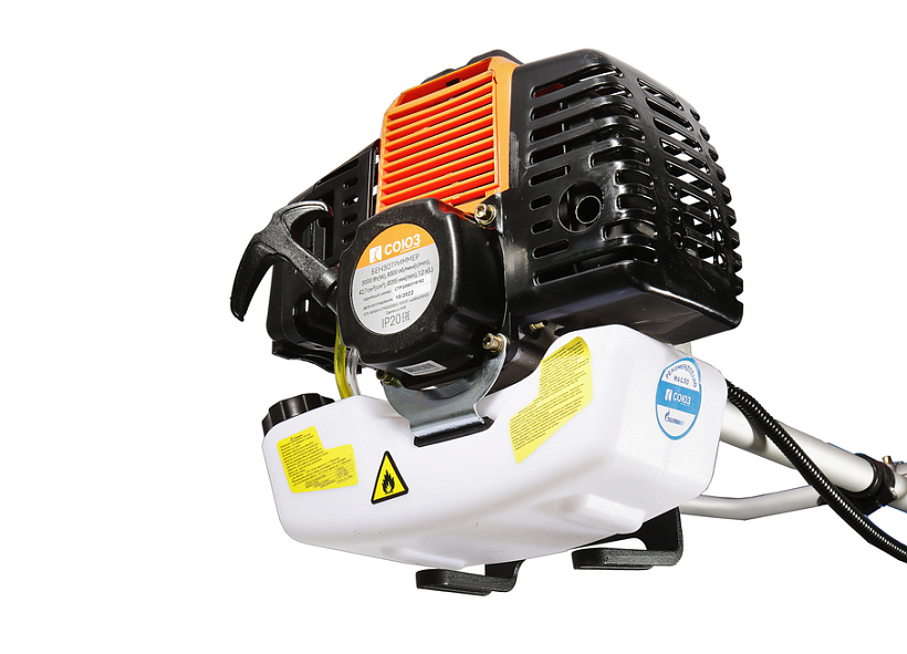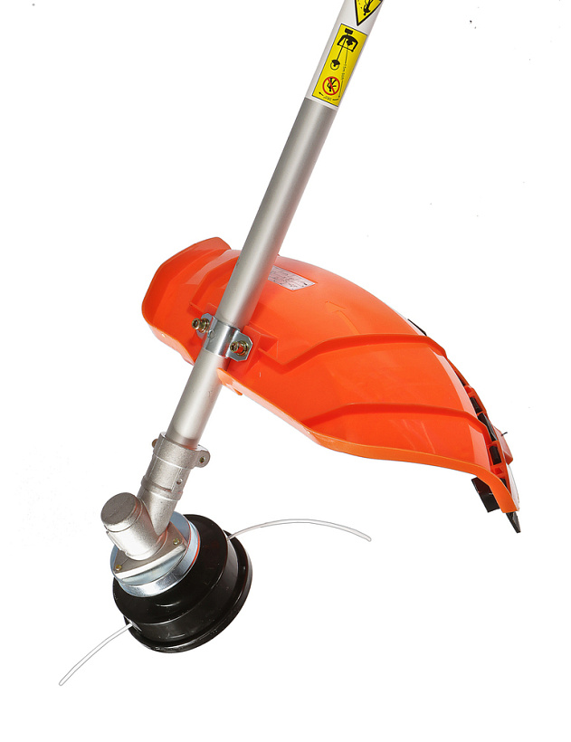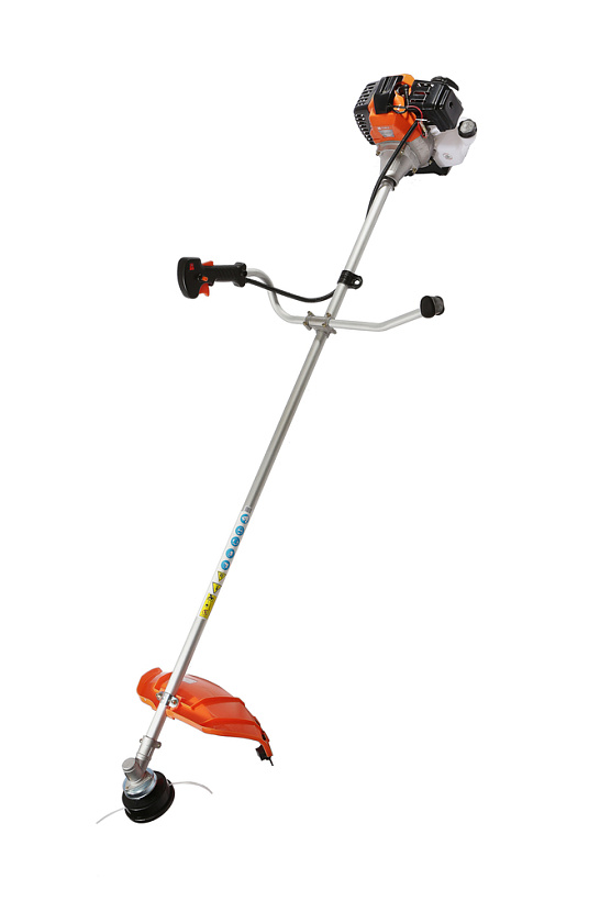 Модель оснащена мощным и экономичным двухтактным двигателем рабочим объемом 42.7 куб см (мощность 3 кВт), позволяющим уверенное использование в качестве режущей оснастки не только косильных головок с леской разных видов, но и металлических ножей, рассчитанных на скашивание густой травы, кустарников, сухостоя. Легкость запуска инструмента гарантирует механизм облегченного старта со специальной дополнительной пружиной. Благодаря праймеру, легкому доступу к свече зажигания, и, полупрозрачному топливному баку модель проста и удобна в обслуживании. Инструмент имеет расширенную базовую комплектацию, куда входят ременной подвес (через одно плечо), косильная головка для лески и трехзубый нож.