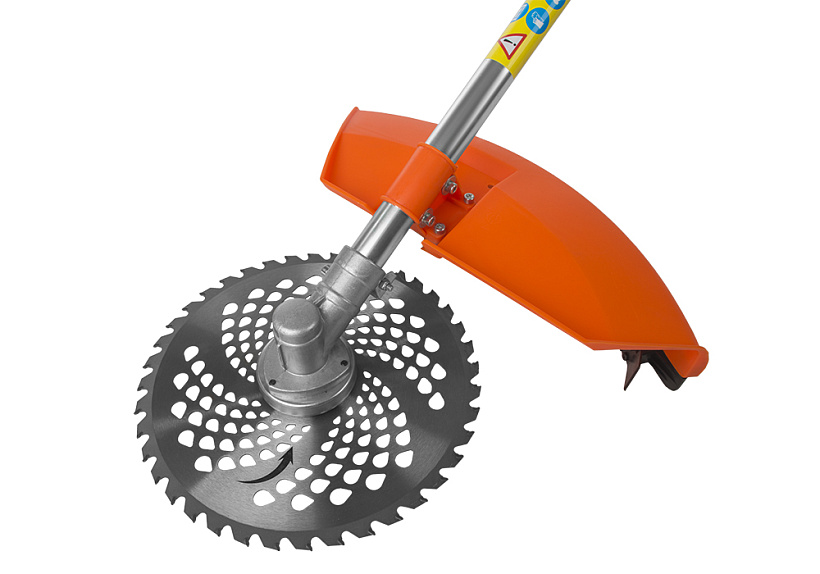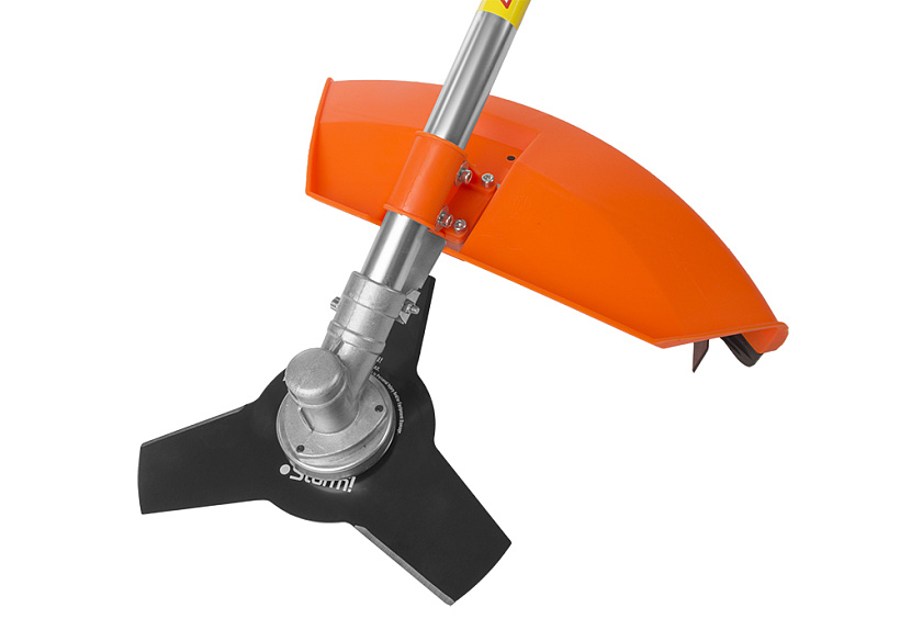 Универсальный защитный кожух можно использовать с ножом- косой для жестких зарослей, фрезой из упрочненной углеродистой стали с твердосплавными напайками для кустарника и тонких деревьев или кордовой головкой для травы. При этом замена лезвия производится просто и безопасно.