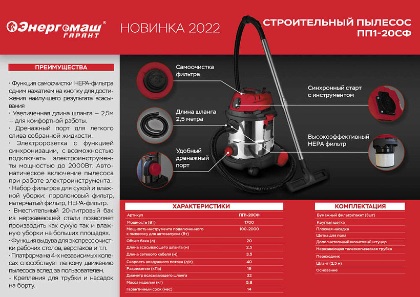 Промышленный пылесос Энергомаш ГАРАНТ ПП1-20СФ