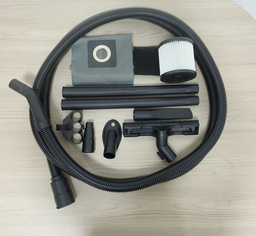 Модель комплектуется пластиковой составной трубкой, высокопрочным гофрированным шлангом 4 метра, набором насадок, набором фильтров, мешком пылесборником, а также универсальным адаптером. Удобству перемещения пылесоса с места на место способствует платформа на 4-х независимых колесах.