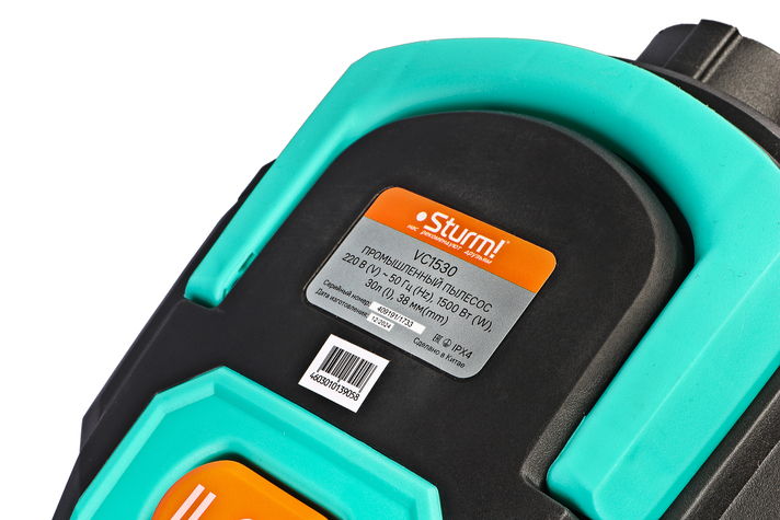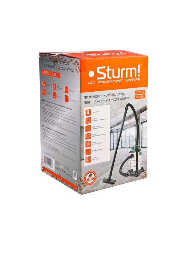 Sturm VC1530 – универсальный строительный пылесос – незаменимый помощник при уборке как в мастерских, так и в бытовых помещениях, офисах, квартирах, салонах автомобилей и т д. Благодаря наличию вместительного 30 литрового бака, пылесос позволяет производить уборку на достаточно больших площадях, без необходимости его частой очистки. Бак изготовлен из нержавеющей стали, что гарантирует стойкость к механическим повреждениям и агрессивным средам. Модель оснащена 1500 Вт электромотором, позволяющим добиться высоких показателей по скорости воздушного потока (до 30 м / с) и разрежению на входе – это способствует быстрому и эффективному удалению мусора, и пыли. Помимо традиционного режима всасывания, конструкцией предусмотрен режим выдува воздуха – он идеально подходит для экспресс-очистки рабочих столов и верстаков, а также очистки штроб и т д. Также, пылесос может применяться и для сбора негорючих жидкостей. Для удаления собранной жидкости в нижней части бака предусмотрена сливная горловина. Благодаря мощной системе фильтрации, с применением высокоэффективного HEPA фильтра, предотвращается попадание пыли и абразивных частиц в двигатель. Важной особенностью Sturm VC1530 является функция дистанционной самоочистки фильтра нажатием специальной кнопки в верхней части корпуса. Наличие функции синхронного старта, позволяет использовать пылесос, как единую систему с любым другим инструментом мощностью от 110 до 2000 Вт – при ее активации, запуск пылесоса производится автоматически сразу после запуска основного инструмента, что положительно влияет на удобство работы и позволяет сконцентрировать внимание преимущественно на рабочем процессе, а не вспомогательных операциях. Модель комплектуется пластиковой составной трубкой, высокопрочным гофрированным шлангом 2,5 метра, набором насадок, набором фильтров, мешком пылесборником, а также универсальными адаптероми. Удобству перемещения пылесоса с места на место способствует платформа на 4-х независимых колесах.