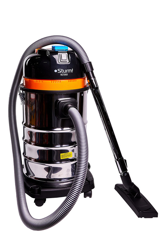 Sturm VC7203 – универсальный строительный пылесос для интенсивной эксплуатации – незаменимый помощник при уборке, как в мастерских, так и в бытовых помещениях, офисах или квартирах. Представляет оптимальное сочетание производительности, выверенной эргономики и широкого функционала. Благодаря наличию вместительного 30 литрового бака из нержавеющей стали пылесос позволяет производить уборку на достаточно больших площадях, без необходимости его частой очистки. Модель оснащена мощным 1600 Вт электромотором, позволяющим добиться высоких показателей по скорости воздушного потока (до 40 м / с) и разрежения на входе (до 17 кПа) – это способствует быстрому и эффективному удалению мусора и пыли. Дополнительную надежность при работе гарантирует встроенная защита двигателя от перегрева. Помимо традиционного режима всасывания, конструкция пылесоса предусматривает и возможность выдува воздуха, идеально подходящую для экспресс-очистки от мусора рабочих столов и верстаков, а также очистки штроб и т д. Кроме того, устройство может эффективно применяться и для сбора негорючих жидкостей. Важной особенностью модели Sturm VC7203 является функция синхронного старта, позволяющая использовать пылесос, как единую систему с другим инструментом – при ее активации запуск пылесоса производится автоматически сразу после запуска основного инструмента, что положительно влияет на удобство работы и позволяет сконцентрировать внимание пользователя преимущественно на рабочем процессе, а не вспомогательных операциях. Модель комплектуется металлической телескопической трубкой со ступенчатой регулировкой длины, двухметровым высокопрочным гофрированным шлангом, а также широким набором насадок, обеспечивающих универсальность применения. Удобству перемещения пылесоса с места на место способствует платформа на 4-х независимых колесах.