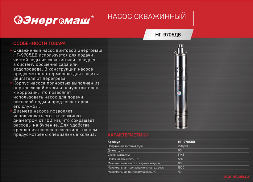 Насос скважинный Энергомаш НГ-9705ДВ предназначен для перекачивания воды из неглубоких и узких скважин.