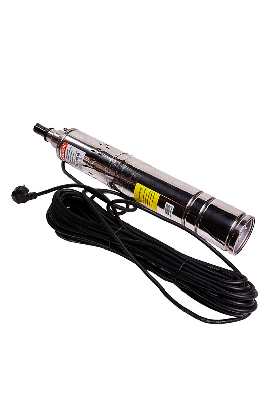 Sturm WP9705DW – погружной скважинный насос – предназначен для перекачивания чистой воды без песка или иных примесей из относительно неглубоких, узких скважин (минимальный диаметр скважины – 95 мм). Обладает небольшими габаритными размерами, благодаря чему удобен в транспортировке. Корпус устройства изготовлен из нержавеющей стали и стоек к воздействию агрессивной среды и механическим повреждениям. Модель оснащена рабочим элементом в виде винта-шнека и характеризуется высокой производительностью – способна перекачивать за час до 1600 литров жидкости и обеспечивать ее подачу на высоту до 95 метров, осуществляя забор с глубины до 30 метров. Максимальная температура перекачиваемой воды не должна превышать 40 °C. Двигатель насоса имеет масляное охлаждение, что способствует его малому износу в процессе эксплуатации. Также, в конструкции Sturm WP9705DW предусмотрена термозащита – она отключает питание при перегреве и позволяет возобновить работу при остывании устройства до рабочей температуры. Наличие длинного 20-ти метрового кабеля питания дает возможность установить насос на необходимой глубине погружения.